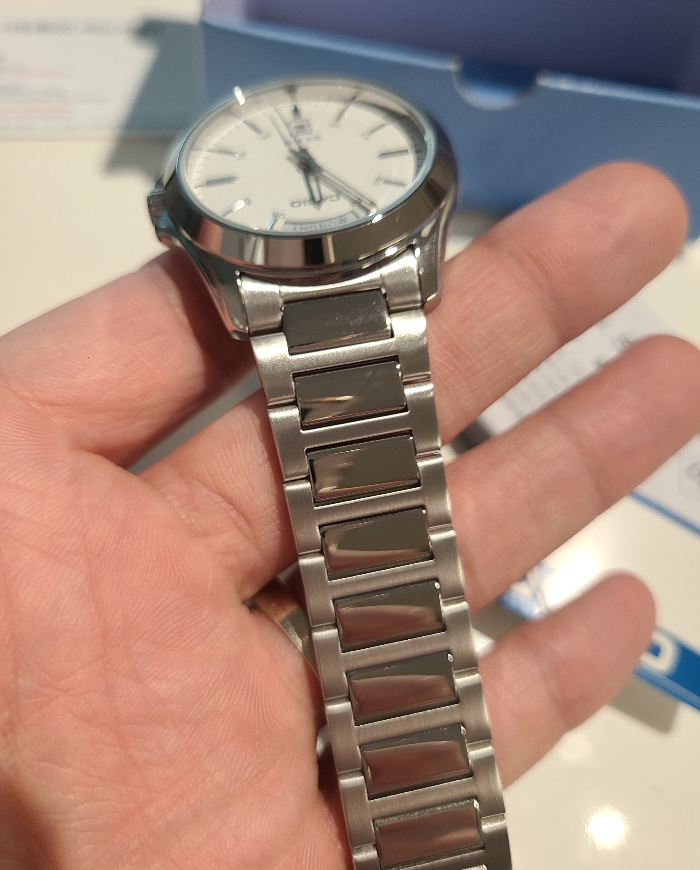 광택이 보기가 좋습니다. 손목에 맞게 스트랩에 중간구멍을 하나 더 뚫었더니 사이즈도 딱입니다.