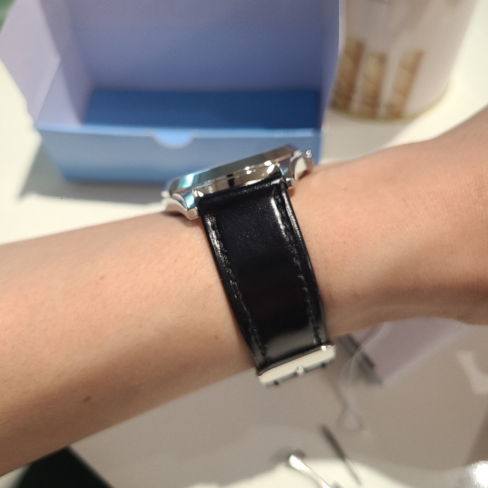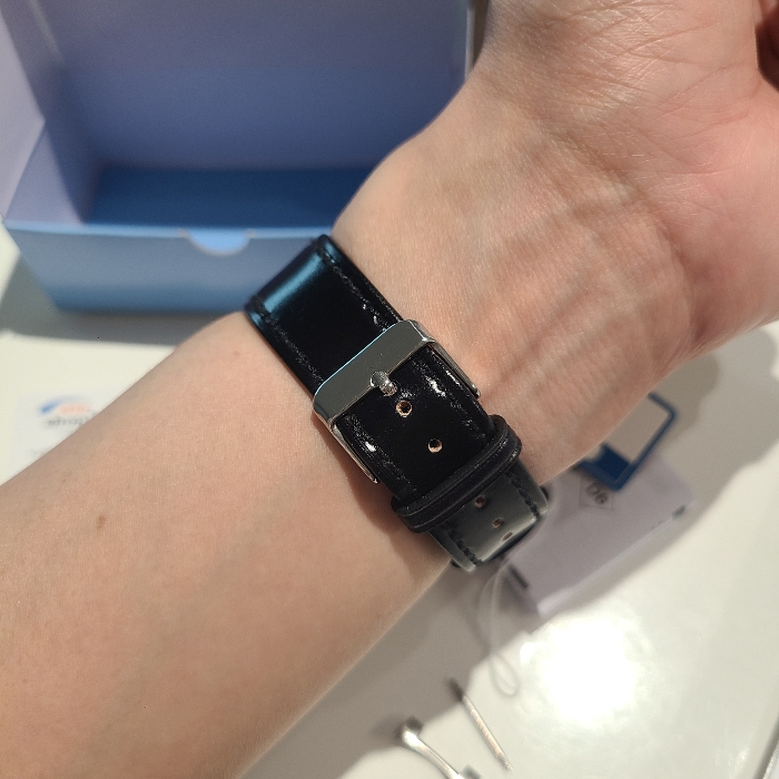 가죽 스트랩이 진한 검은색이고 특별한 패턴 없이 매끈한 표면을 가지고 있어서 광택이 많은 이 시계에 잘 어울릴 듯 싶었습니다.