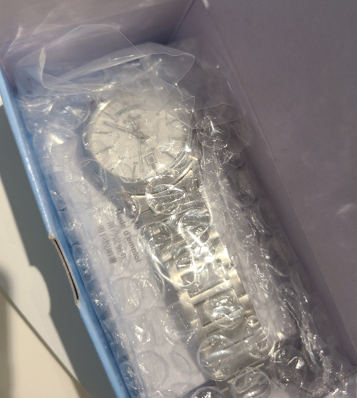 에어캡으로 잘 포장되어 있군요. 쿼츠 무브먼트라 충격이 크게 걱정되지는 않습니다만, 그래도 배송 중 움직임을 최소화할 수 있도록 포장이 잘 되어있는 편이 만족도가 높습니다.