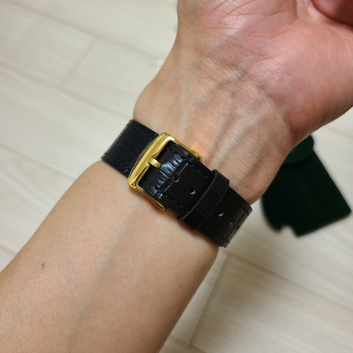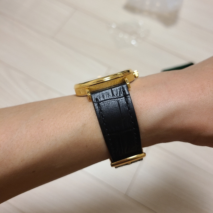 버클도 케이스의 금색과 깔맞춤을 해 두어서 다른 시계줄에 활용할까 했지만 20mm 러그에서 시작해 18mm로 줄어드는 두툼한 디자인이라 드레시한 시계줄의 버클 너비(16mm)에 맞지 않아서 활용은 못하게 되었습니다.