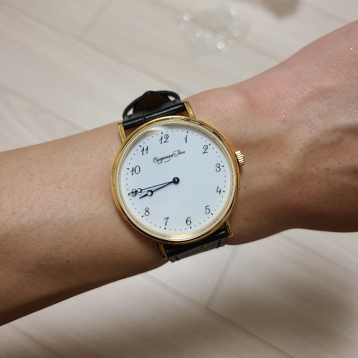 손목에 얹어보아야지요. 얇은 러그에 비해 케이스가 커보여서 약간 대두느낌이 나는데, 그게 또 이 시계의 매력인 것 같습니다. 여백을 많이 만들어내야 에나멜 다이얼을 더 많이 느껴볼테니 말이지요.
