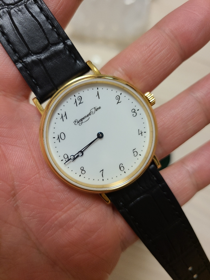 간만에 알리익스프레스 손목시계를 하나 샀습니다. 사이즈때문에 늘 망설이던 제품인데, 탈출시간(Escapement time)의 브레게 카피제품입니다. 일명 탈레게이지요. 금장과 은장 두 가지 옵션이 있는데 저는 금장을 골랐습니다. 제품 링크는 아래에 첨부해두겠습니다.
