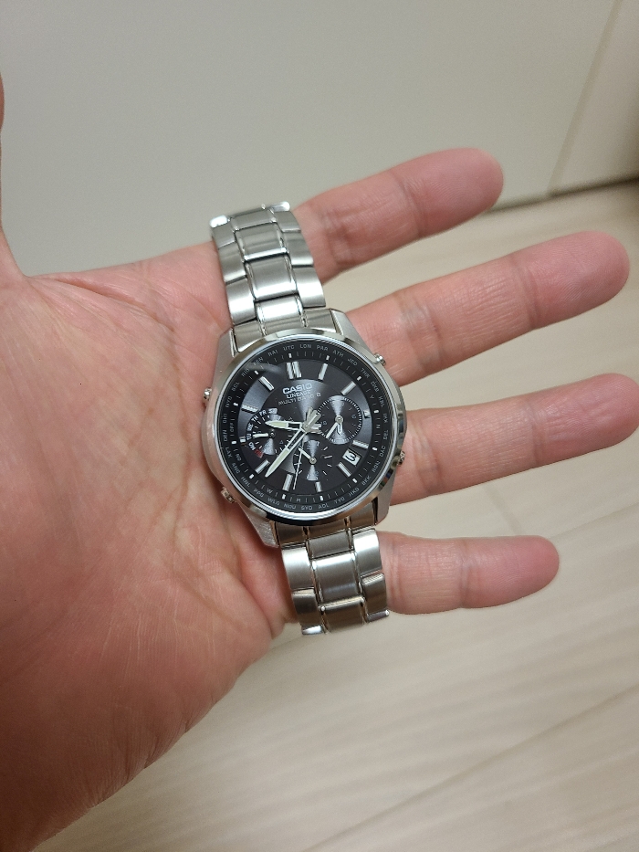 날짜창이 검은색이었으면 좋겠다 하고 찾아보니 이 모델이랑 똑같이 생겼는데 티타늄으로 출시된 버전이 있습니다. 해당 시계는 날짜창이 검은색이더군요 (글라스도 미네랄이 아니라 사파이어로 올라갔던 것 같습니다). 카시오도 급나누기를 합니다. 뭐 저야 이 시계가 비율이 워낙 좋으니 날짜창이 정도는 적당히 넘어가줄 의향이 있습니다.