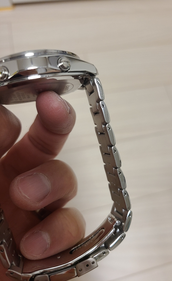 브레이슬릿은 움직일 때 삐그덕거리는 소리가 좀 나서 고급스러움과는 거리가 멉니다. 하지만 역시 카시오! 하며 진짜배기 손목시계 브랜드라는 것을 또 한번 느낀 부분은, 브레이슬릿은 모든 링크를 조절이 가능하게 만들어놓았다는 점입니다. 브레이슬릿은 길이에 비해 손목이 얇은 경우, 6시방향 브레이슬릿을 최대한으로 줄여도 버클이 손목 중앙에 오지 않아서 손목시계 알맹이가 자꾸 12시방향으로 돌아가는 문제가 있습니다. 이녀석은 고정링크라는게 없으니 손목에 맞게 얼마든지 조절이 가능합니다. 역시 갓시오..