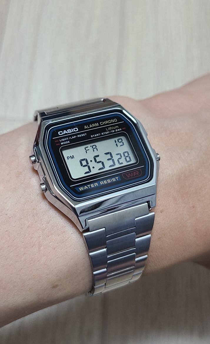 사실 손석희 시계는 A168WA 모델이라 하는데, 크기가 저의 158보다 조금 더 큽니다. 그럼에도 얇고 작은 손목시계를 원했기에 A158WA-1D로 선택했습니다.